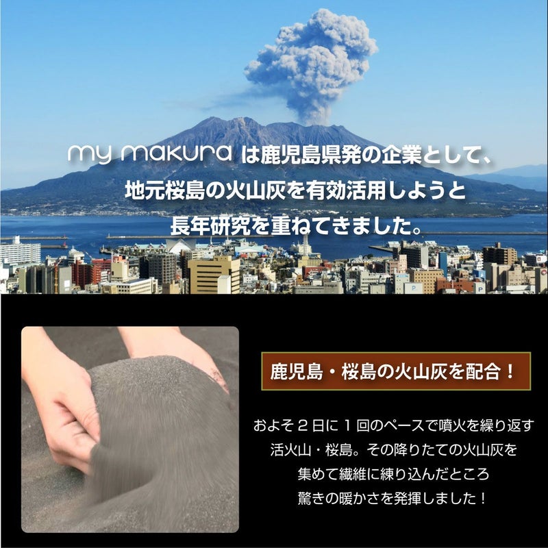 鹿児島・桜島の火山灰を配合! およそ2日に1回のペースで噴火を繰り返す 活火山・桜島。その降りたての火山灰を 集めて繊維に練り込んだところ 驚きの暖かさを発揮しました!