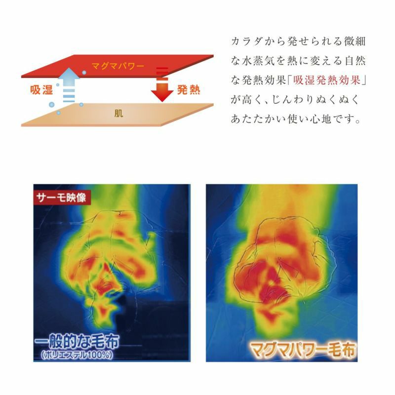 冷え性の方、寒がりな方に。あたたまりやすく保温性に優れたマグマパワー。生地に熱源を当て温度を計測する試験では、一般的な毛布生地よりも温度の上昇が早く、最大約2.4℃の温度差が生まれ、熱源を切った後もあたたかさを長く保つという結果が出ました。