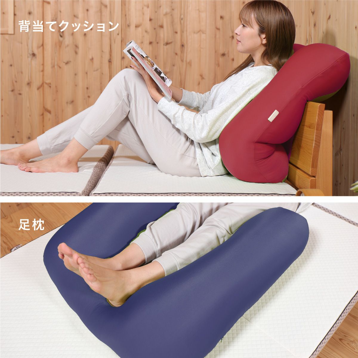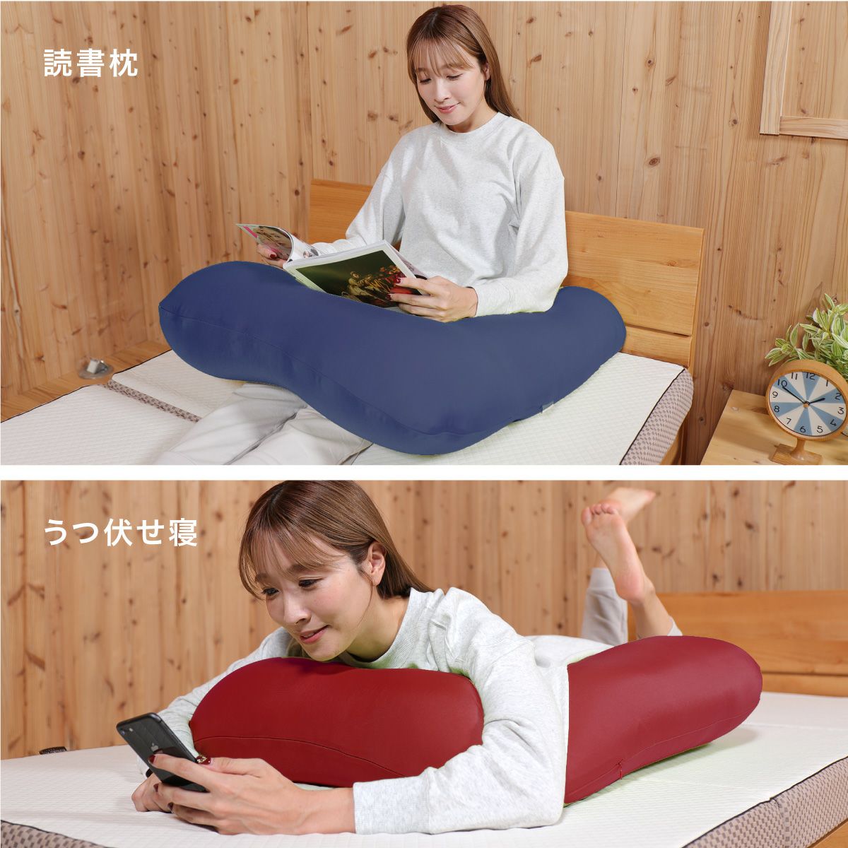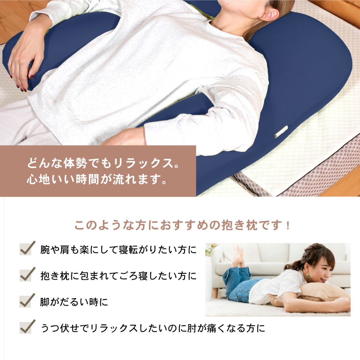 U字形状は頭から腕が抱きまくらに自然にフィット。体を安定して支えます。