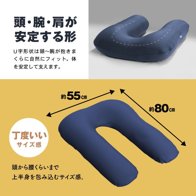 U字形状は頭から腕が抱きまくらに自然にフィット。体を安定して支えます。
