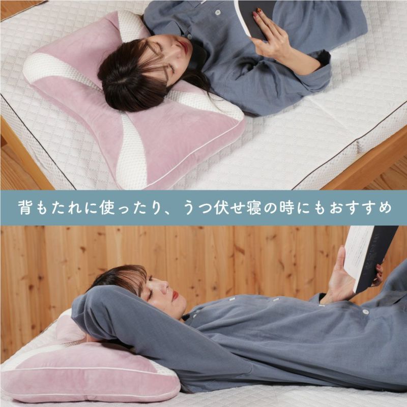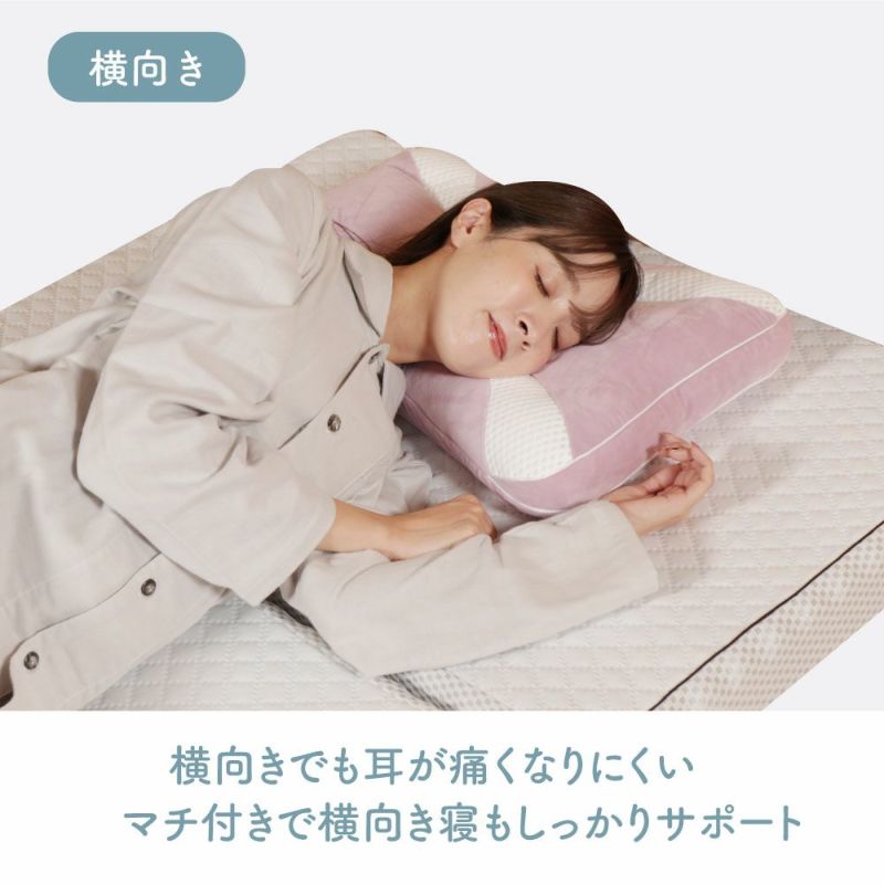 横向き寝時にも充分な高さがあるので首や肩が痛くなりにくく、寝返りの際も優しく頭を支えます。