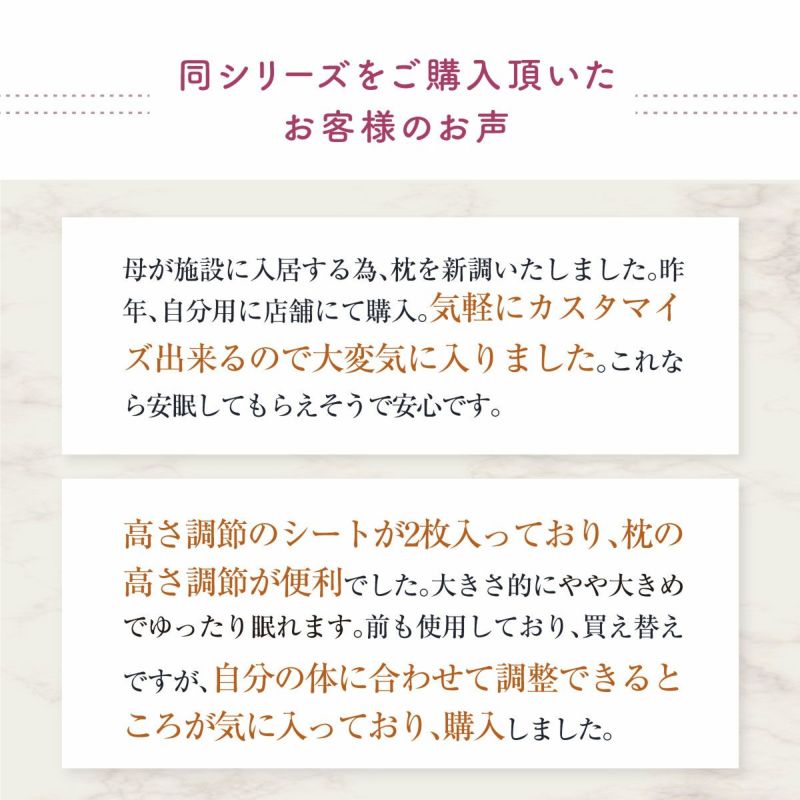 硬さの調整が出来て快適です。通気性も良くて、毎朝汗ビッショリ頭が改善して、目覚めがとてもいいです。ありがとうございます!