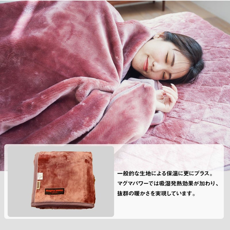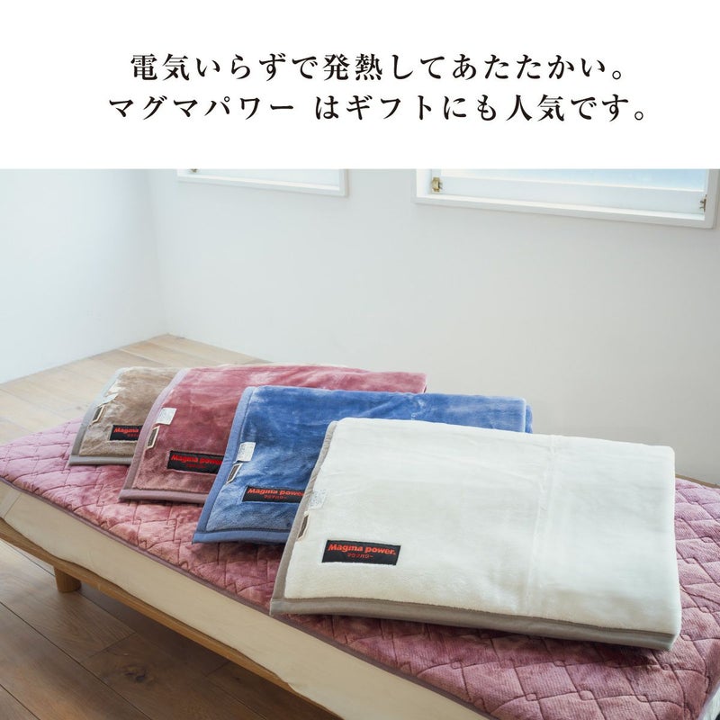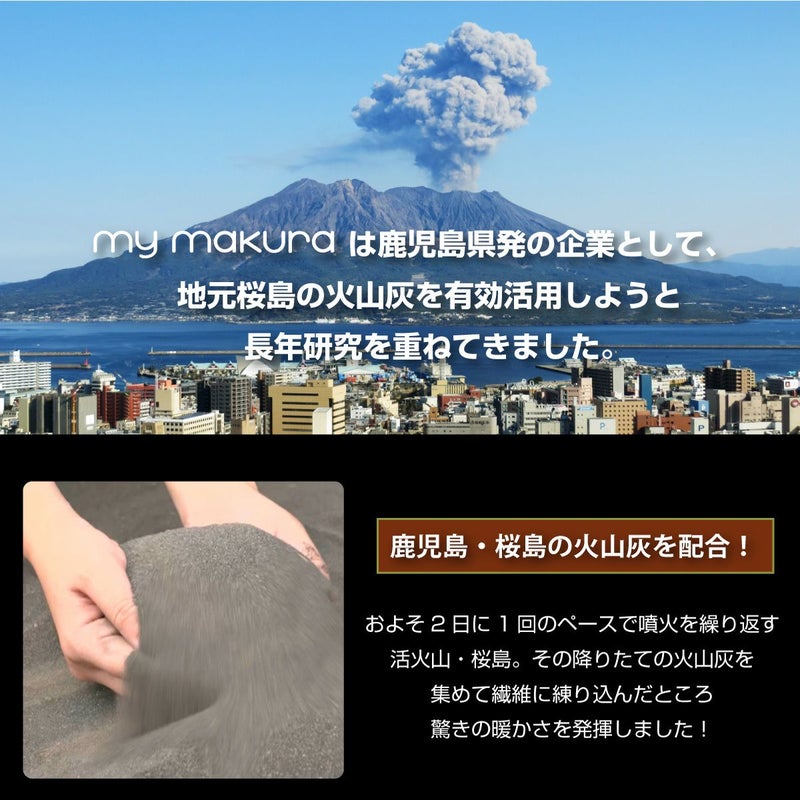 取り扱い上のご注意 ・家庭洗濯の際は、タンブル乾燥時の摩擦により毛羽立ちやピリングが生じることがありますので 回転式乾燥機のご使用をお避けください。 ・ご使用中及びお洗濯中の摩耗により毛羽が抜ける事があります。 ・毛羽部分が絡み合った時は軽くブラッシングをしてください。 ピリング(毛玉)が出来た時は、ピリングカッター(毛玉取り機)でお手入れしてください。 吸湿&発熱する高機能毛布 マグマパワーの保温効果に驚き。繊維に火山灰を使用し、特許を取得したマグマパワーシリーズ。 鹿児島・桜島の火山灰を配合! およそ2日に1回のペースで噴火を繰り返す活火山・桜島。 その降りたての火山灰を集めて繊維に練り込んだところ 驚きの暖かさを発揮しました!一般的な生地による保温に更にプラス。 マグマパワーでは吸湿発熱効果が加わり、 抜群の暖かさを実現しています。 電気いらずで発熱してあたたかい。マグマパワー はギフトにも人気です。