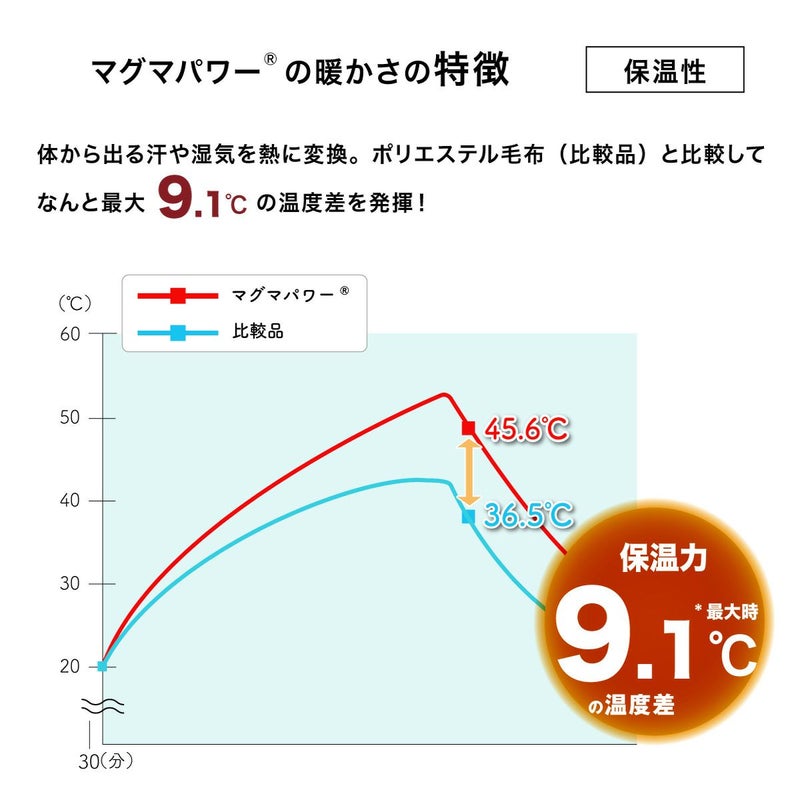 あたたまりやすく保温性に優れたマグマパワー。 一般的な毛布生地よりも温度の上昇が早く、熱源を切った後もあたたかさを長く保つという結果が出ました。 マグマパワーは、一般的な毛布生地が急速に冷えるのに比べて、「冷めにくく、暖かさが長く続く」結果が出ています。