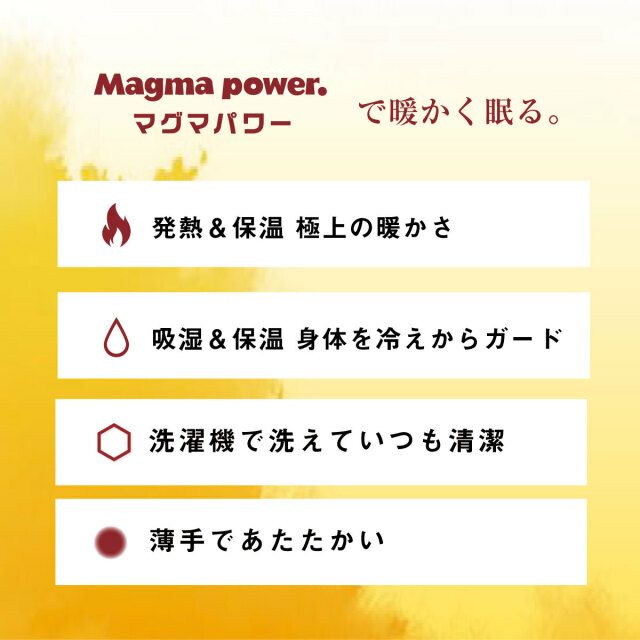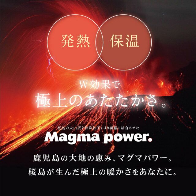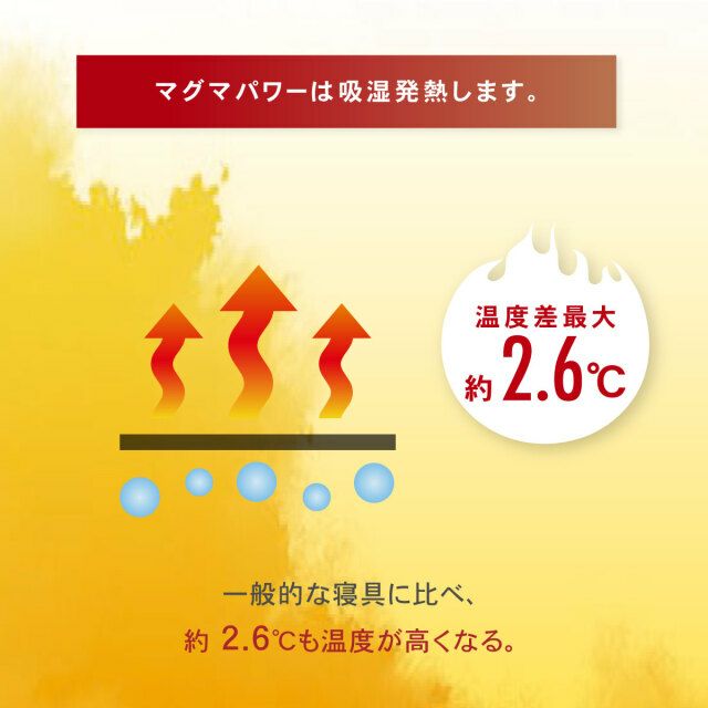 マグマパワーは吸湿発熱します。カラダから発せられる微細な水蒸気を熱に変える自然な発熱効果「吸湿発熱効果」が高く、じんわりぬくぬくあたたかい使い心地です。