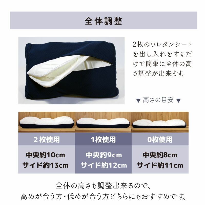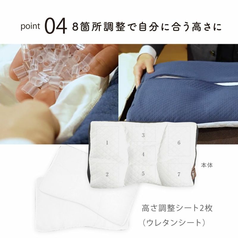 仰向き寝でも横向きでも快適な寝心地です。8箇所調整で自分に合う高さに。