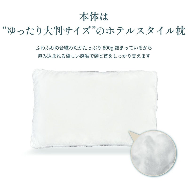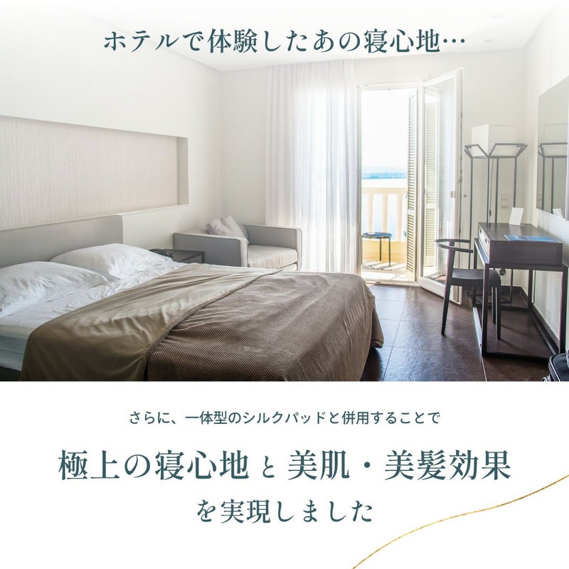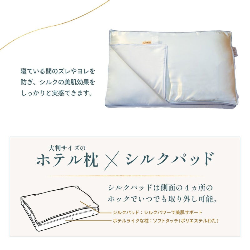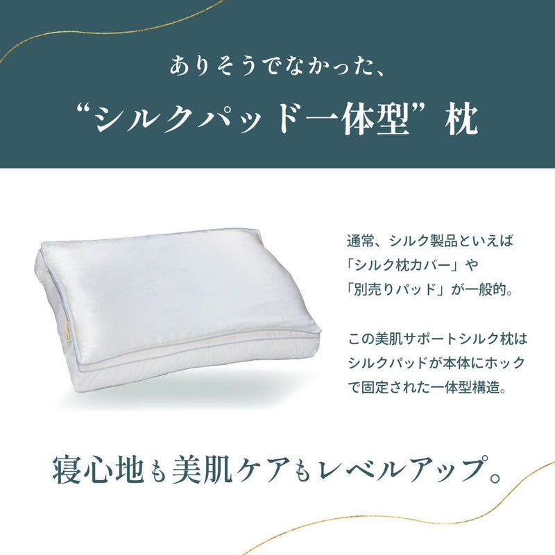 “シルクパッド一体型”枕。寝心地も美肌ケアもレベルアップ。寝ている間のズレやヨレを防ぎ、シルクの美肌効果をしっかりと実感できます。