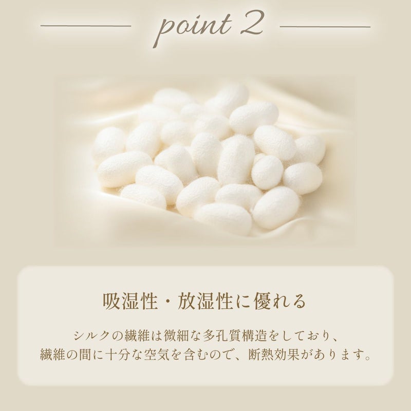 シルクは、人の肌の成分に近いタンパク質(18種類のアミノ酸)で出来ているので、お肌に優しく、しっとりとした潤いをキープする効果が期待されています。