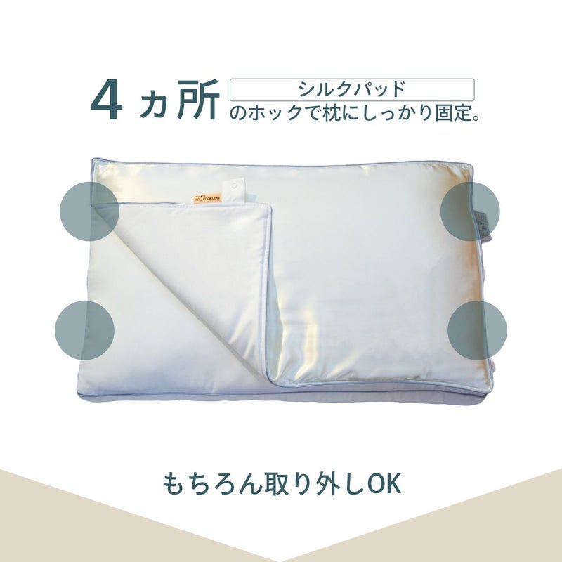 シルクパッドは4ヵ所のホックで枕にしっかり固定。取り外し可能です。