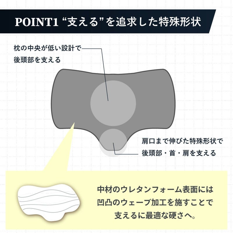 枕の中央が低く肩口まで伸びた特殊形状で後頭部・首・肩を支える