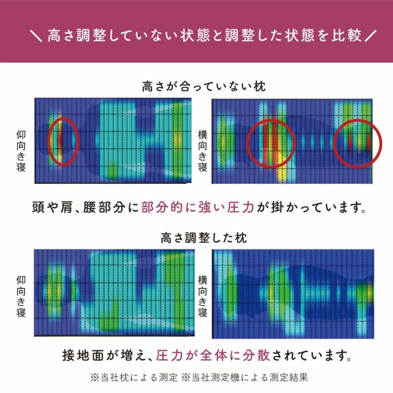 仰向き寝でも横向きでも快適な寝心地です。8箇所調整で自分に合う高さに。