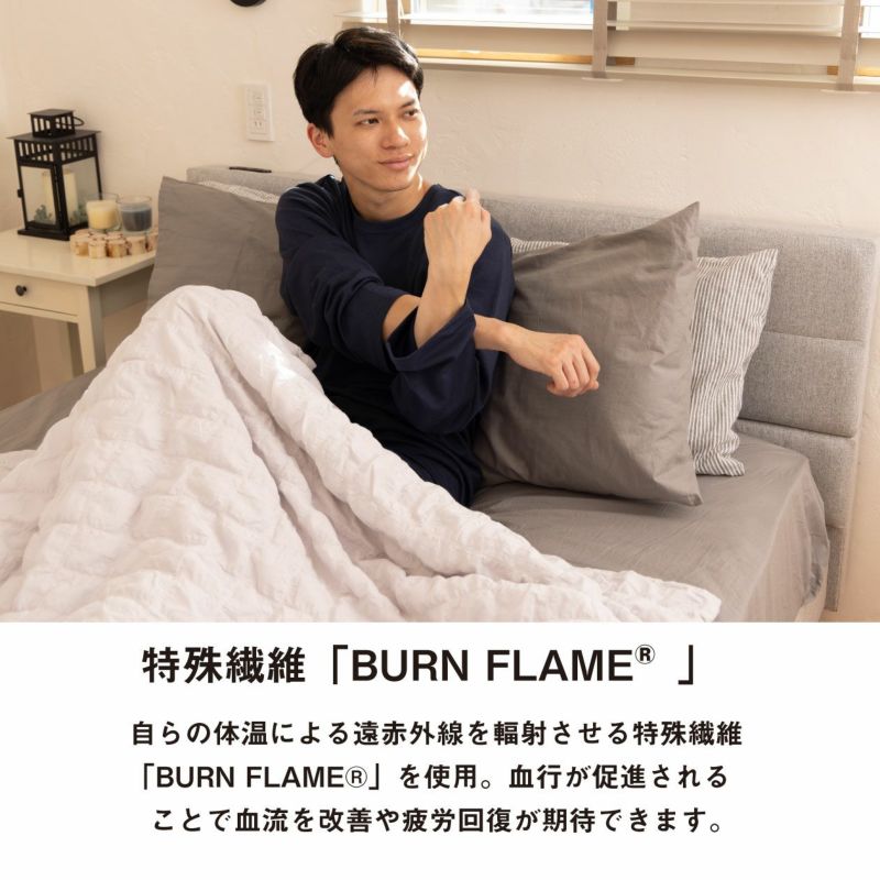 普段の生活をより快適に。遠赤外線の血行促進作用。自らの体温による遠赤外線を輻射させる特殊繊維「BURN FLAME®︎」を使用。血行が促進されることで、疲労回復が期待できます。