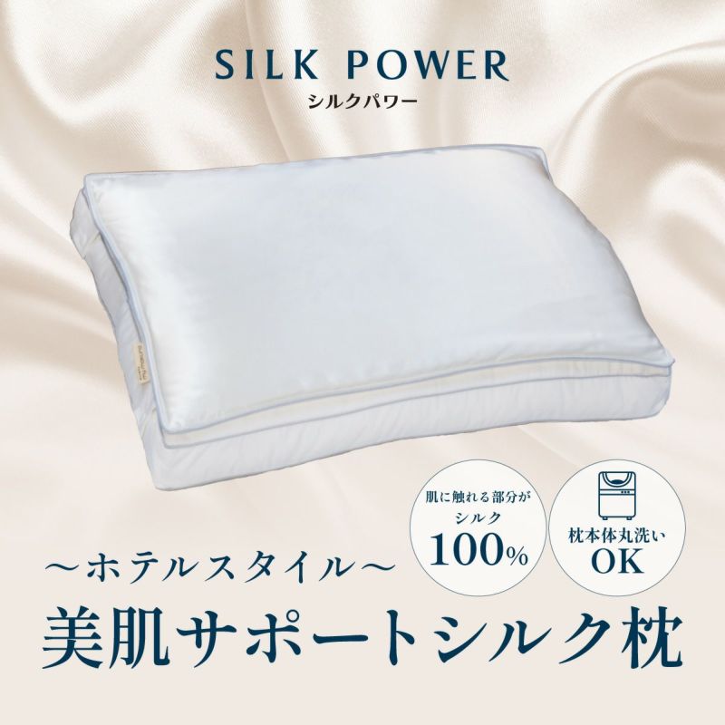 “シルクパッド一体型”枕。寝心地も美肌ケアもレベルアップ。寝ている間のズレやヨレを防ぎ、シルクの美肌効果をしっかりと実感できます。