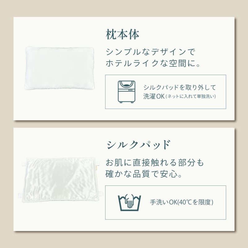 肌に触れる部分がシルク100%。枕本体丸洗いOK。肌サポートシルク枕はシルクパッドが本体にホックで固定された一体型構造。