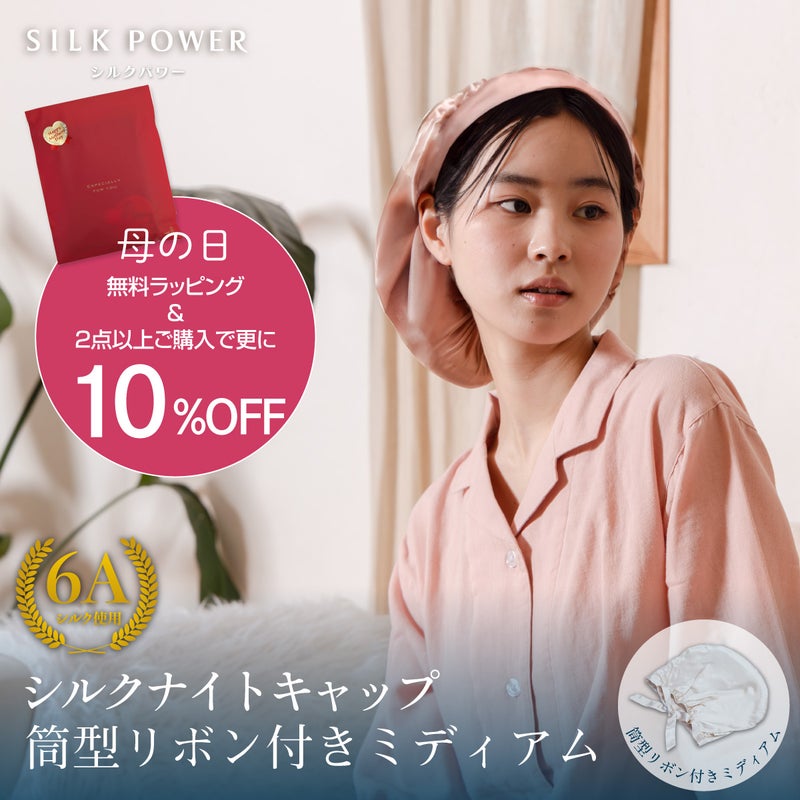 【2点以上ご購入で10%OFF!】シルクナイトキャップ 筒型リボン調整式 ミディアム シルクパワー